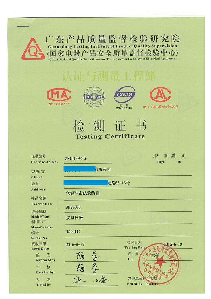 質(zhì)量是用品質(zhì)說(shuō)話的,我司一批設(shè)備通過(guò)“國(guó)家電器產(chǎn)品安全質(zhì)量監(jiān)督檢驗(yàn)中心”計(jì)量認(rèn)證