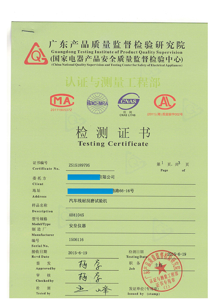 質(zhì)量是用品質(zhì)說話的,我司一批設(shè)備通過“國家電器產(chǎn)品安全質(zhì)量監(jiān)督檢驗中心”計量認證