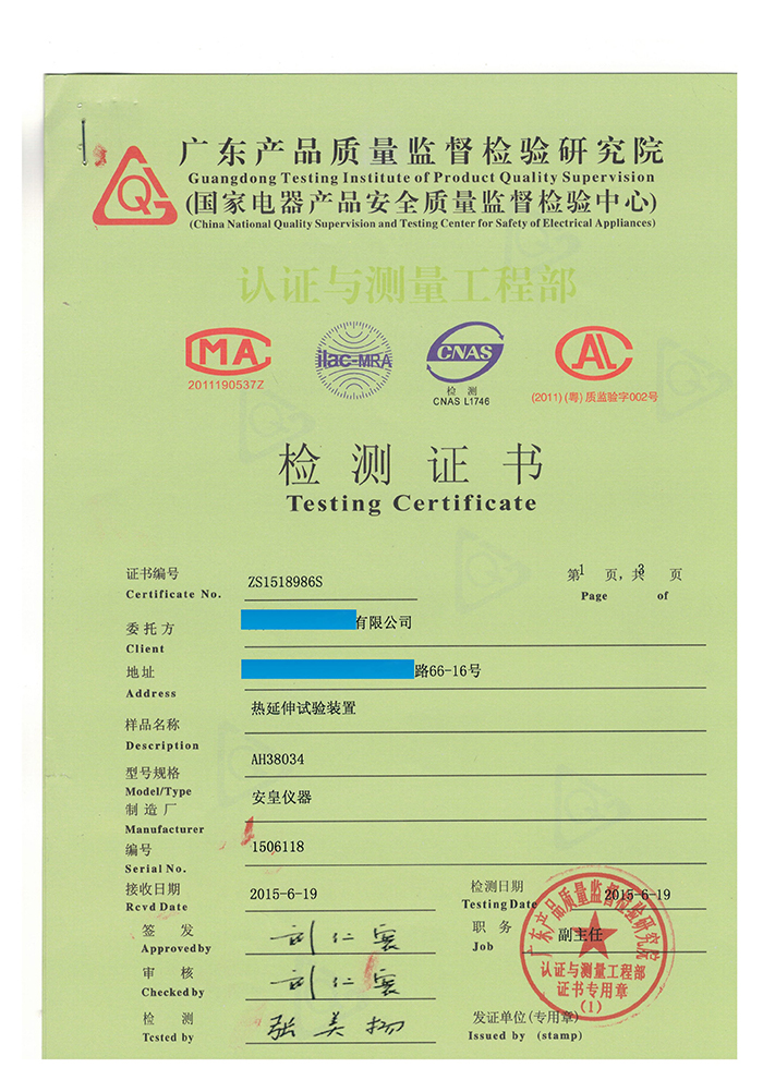 質(zhì)量是用品質(zhì)說(shuō)話的,我司一批設(shè)備通過(guò)“國(guó)家電器產(chǎn)品安全質(zhì)量監(jiān)督檢驗(yàn)中心”計(jì)量認(rèn)證
