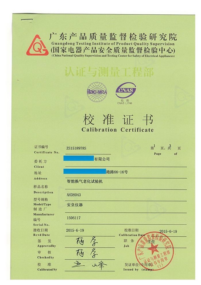 質(zhì)量是用品質(zhì)說話的,我司一批設(shè)備通過“國家電器產(chǎn)品安全質(zhì)量監(jiān)督檢驗中心”計量認(rèn)證
