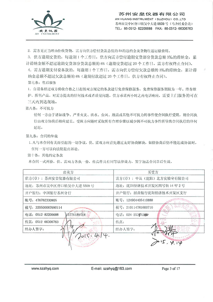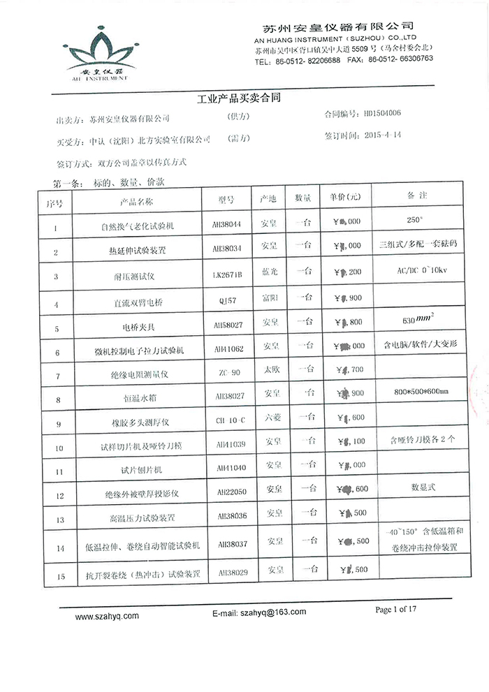 中認(rèn)實(shí)驗(yàn)室這次采購的設(shè)備主要包含了5013、5023的試驗(yàn)項(xiàng)目,我司與去年年底與該院接觸,在設(shè)備選型和技術(shù)參數(shù)確認(rèn)提供了有利的支持,今年年初公司銷售和技術(shù)人員就以上問題去客戶現(xiàn)場洽談,經(jīng)過層層選擇,最終客戶被我們的專業(yè)所打動與4月份和我司簽訂合同(下付合同原件)。在這我們非常感謝中認(rèn)對我們的信賴,所以在后期的售后服務(wù)中我們也得到了中認(rèn)的肯定。