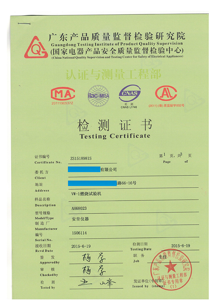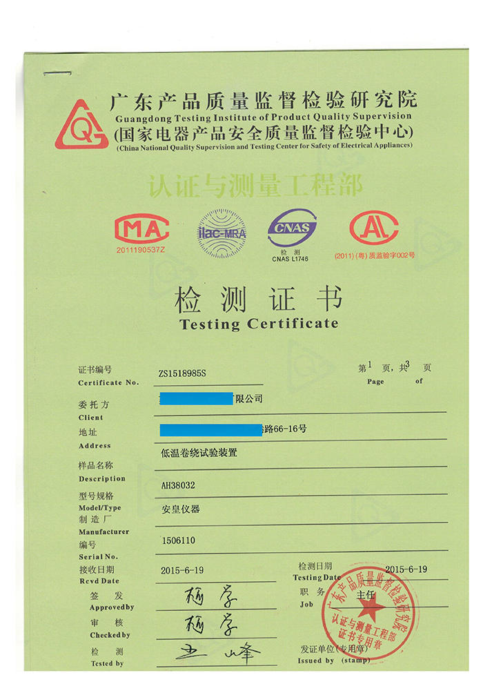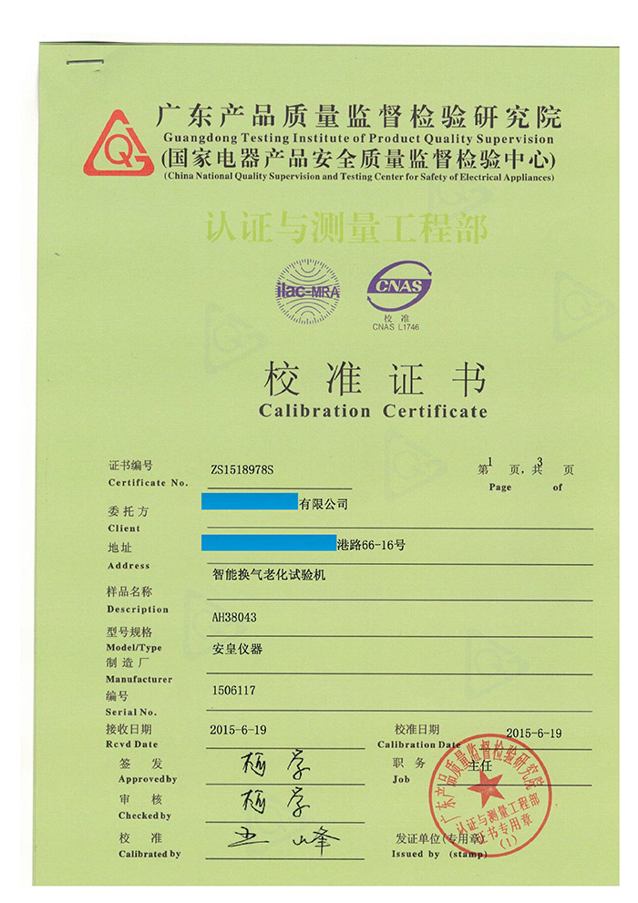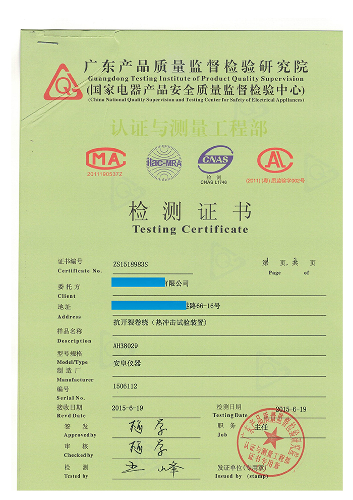 質(zhì)量是用品質(zhì)說話的,我司一批設(shè)備通過“國家電器產(chǎn)品安全質(zhì)量監(jiān)督檢驗中心”計量認證